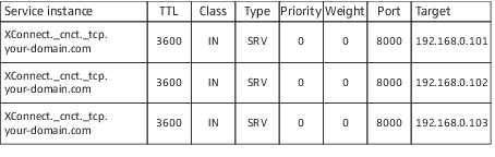 6. Create SRV entries for some or all of the ConnectStation in your cluster. The priority and weight field are currently irrelevant. Set the TTL to a sane value according to your network requirements. Set the port to 8000: