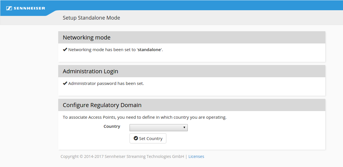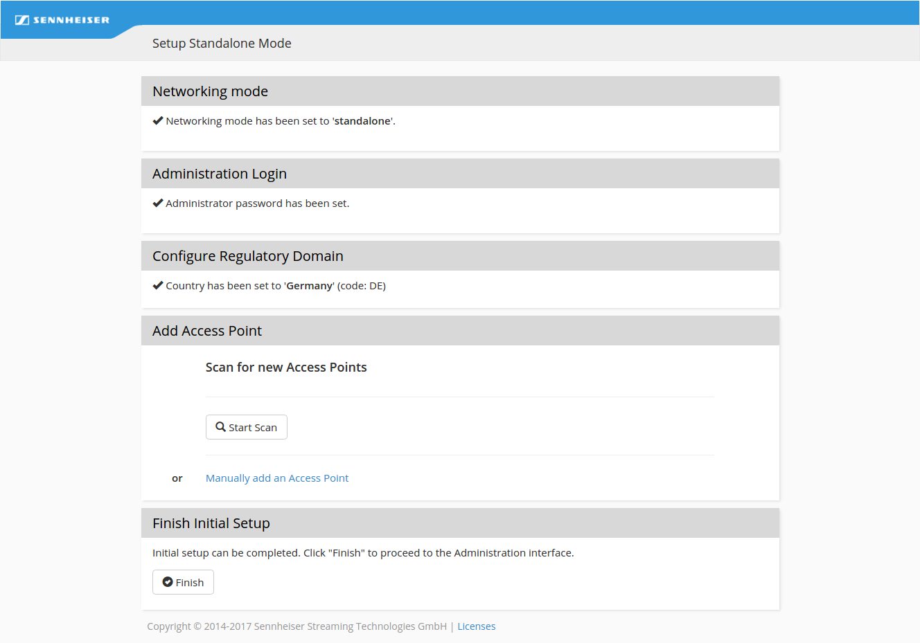 "Network integration"), add a known Access Point manually, or finish the configuration and add an Access Point later on.