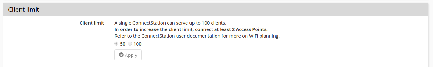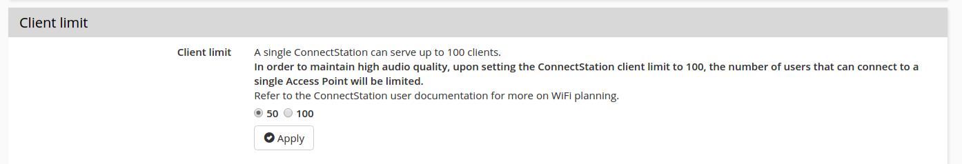 When the number of clients per ConnectStation is increased to 100, a client limit is set on the Access Point: