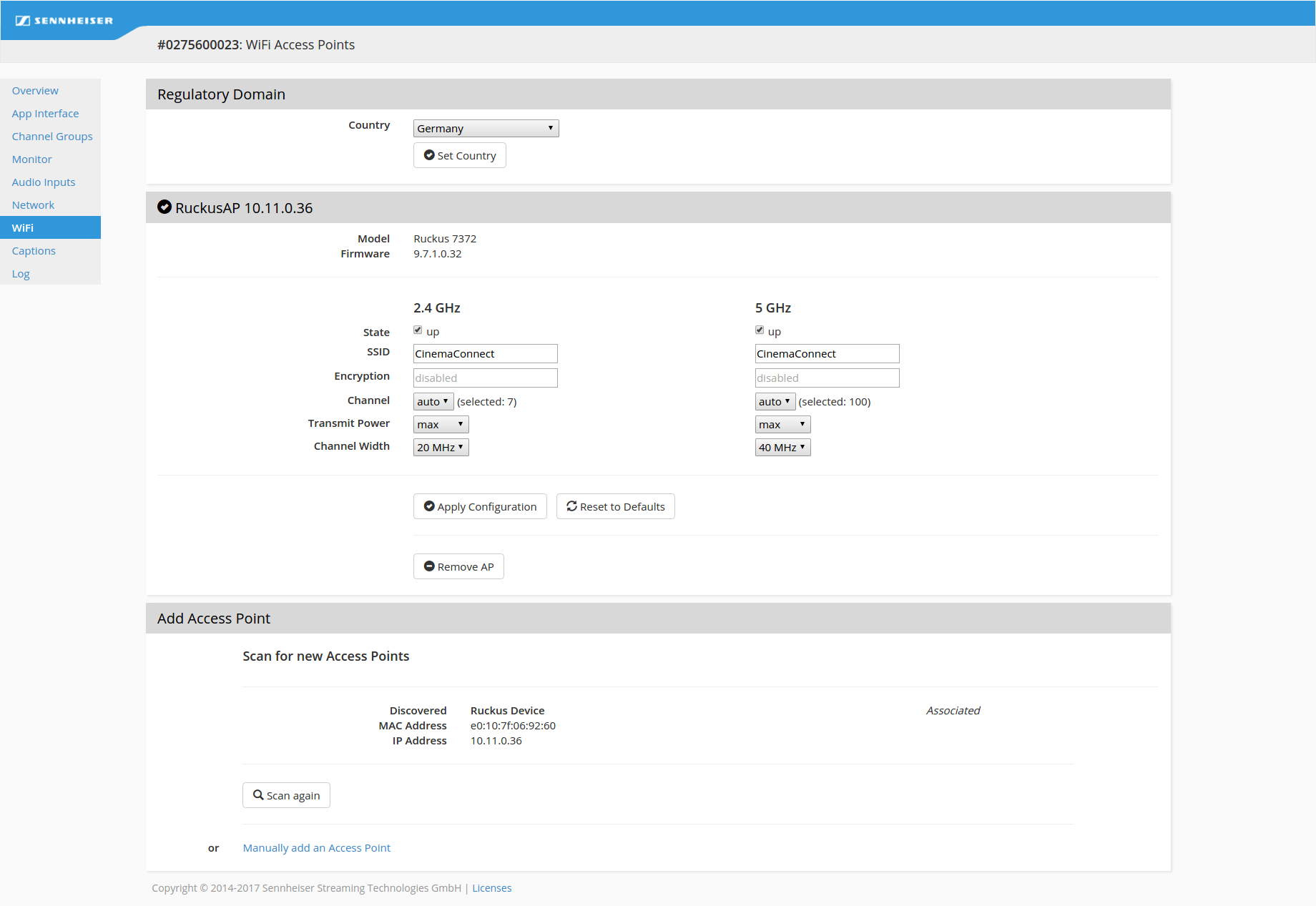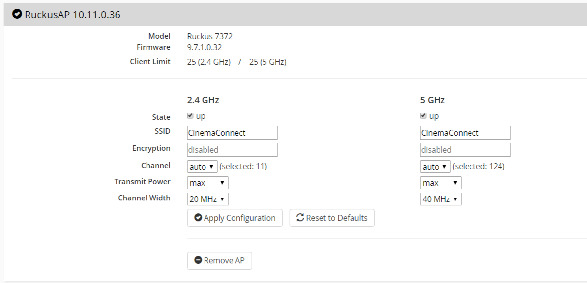 WiFi page of the Admin Interface you can add, remove or configure your Ruckus Access Points. Up to 8 Access Points can be added for a single ConnectStation (see