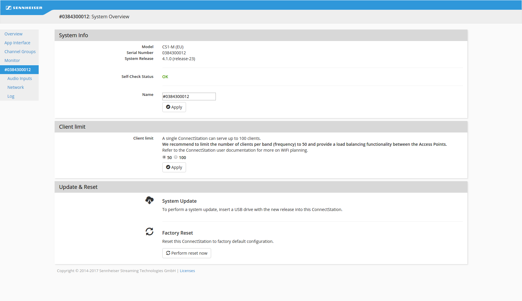 • The default name is the serial number of the ConnectStation. To change it enter a new name and click Apply.