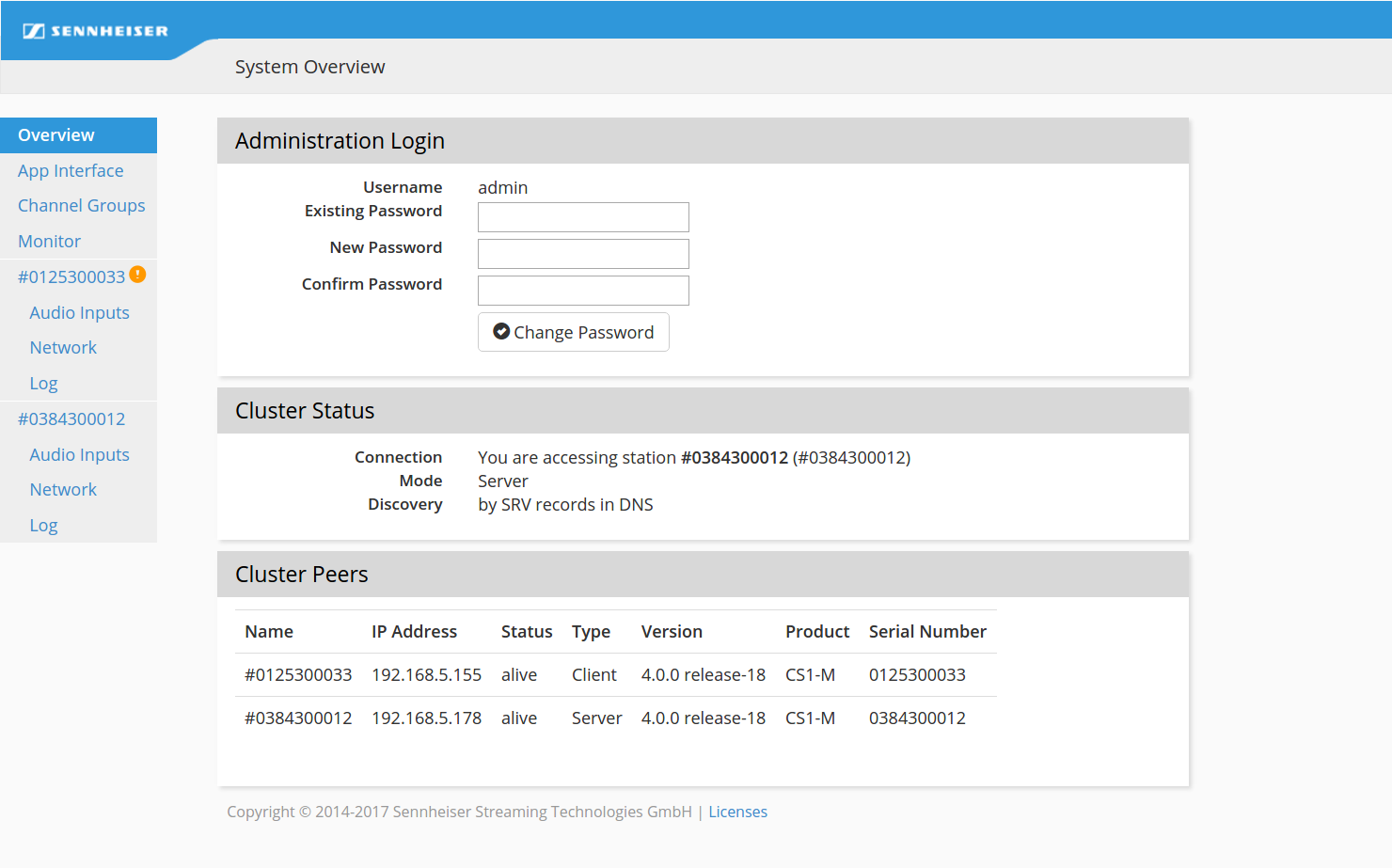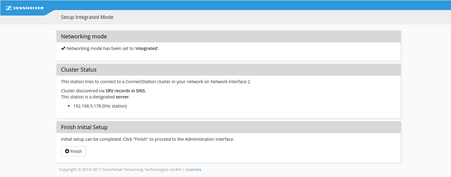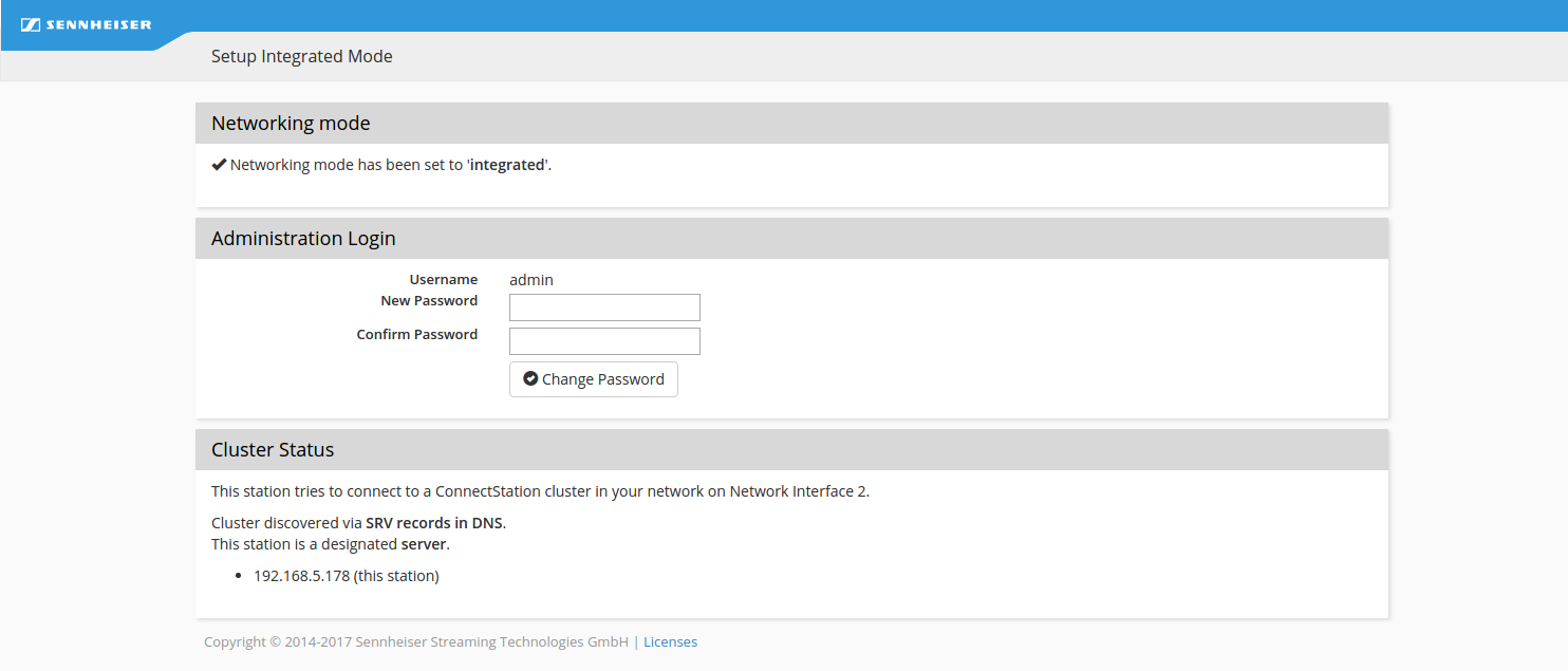 Under Cluster Status you will find information about the ConnectStation cluster. In Integrated Mode, you can connect one or more ConnectStations in one cluster.