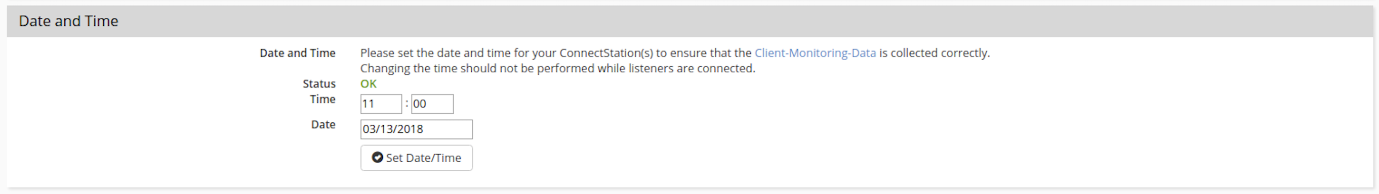 Time Set-Up: Here you can change the time and timezone for your Connect Station which is necessary to generate the client statistics (see