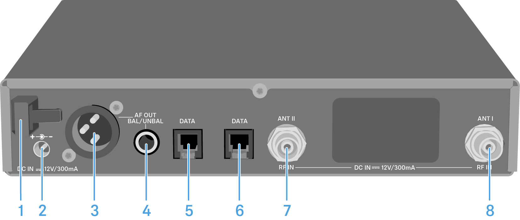 7 Conector hembra BNC, salida de la antena II (ANT II) con entrada de alimentación remota