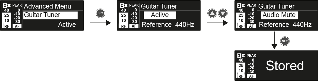 • Audio Mute: El afinador de guitarra está activado. En cuanto la indicación standard Guitar Tuner está abierta en la Pantalla de inicio, la señal de audio se silencia.