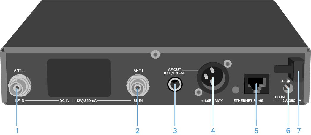 1 Conector hembra BNC, salida de la antena II (ANT II) con entrada de alimentación remota