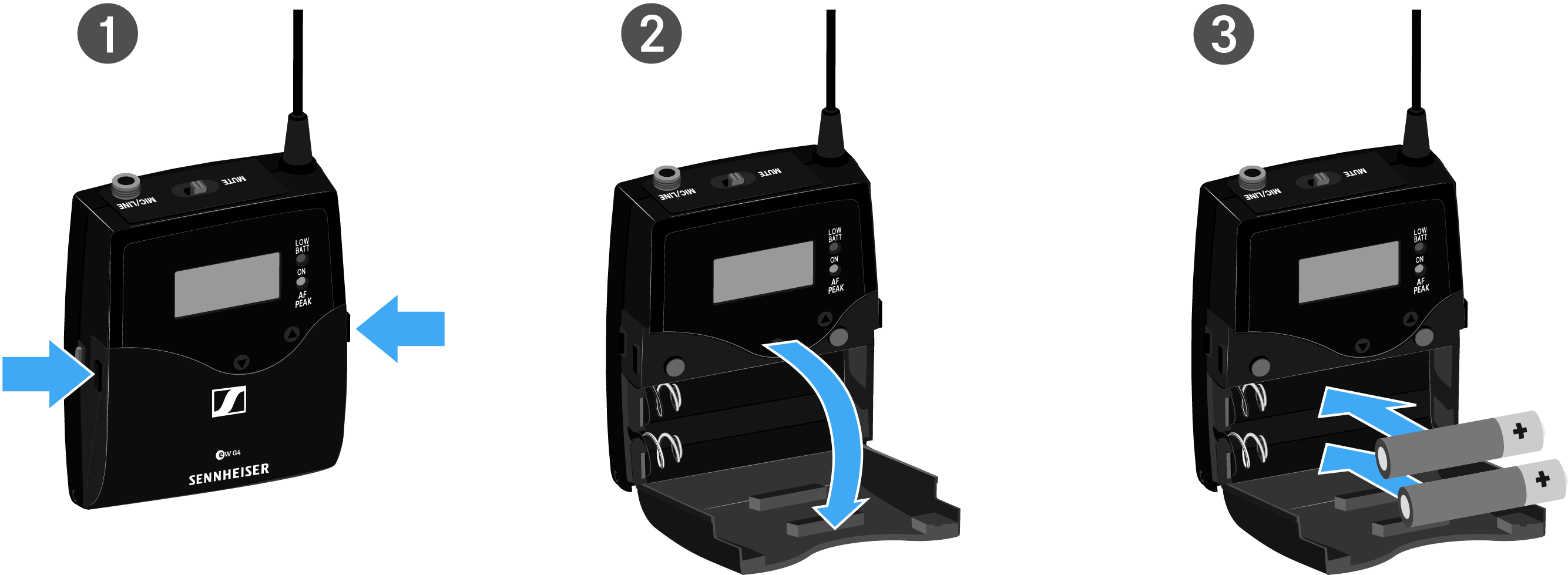 El transmisor bodypack se puede operar con baterías (tipo Mignon AA, 1,5 V) o con la pila recargable de Sennheiser BA 2015.