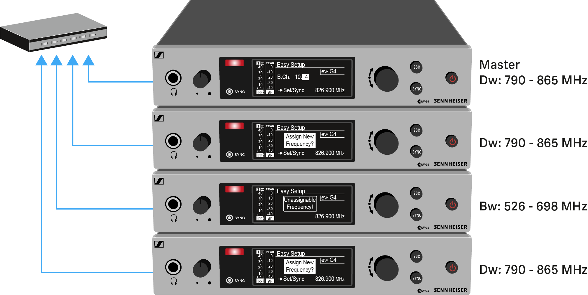 Asigne de esta manera una frecuencia libre a todos los receptores conectados sucesivamente.