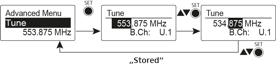 Tune puede ajustar una frecuencia de transmisión para el canal actual, o bien seleccionar un canal del banco de canales
