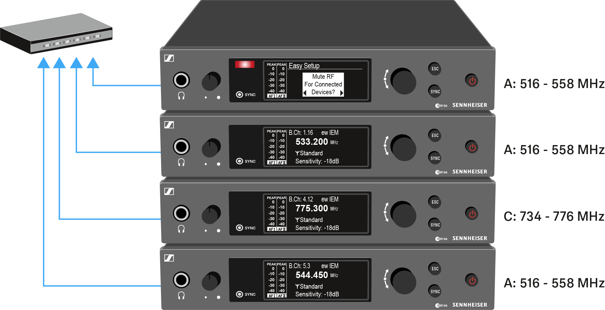 Todos los transmisores conectados en el mismo rango de frecuencias activan el modo Easy Setup Sync.