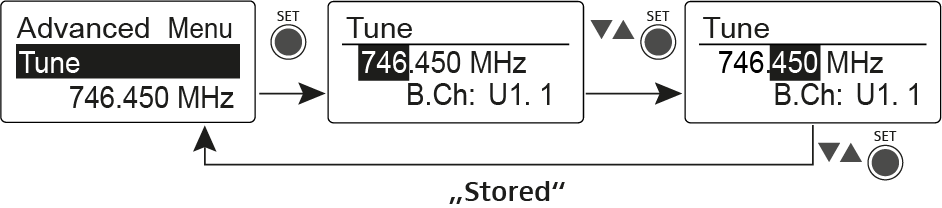 En la opción de menú Tune del submenú Advanced puede ajustar las frecuencias de recepción para los bancos de canales U1 a U6.