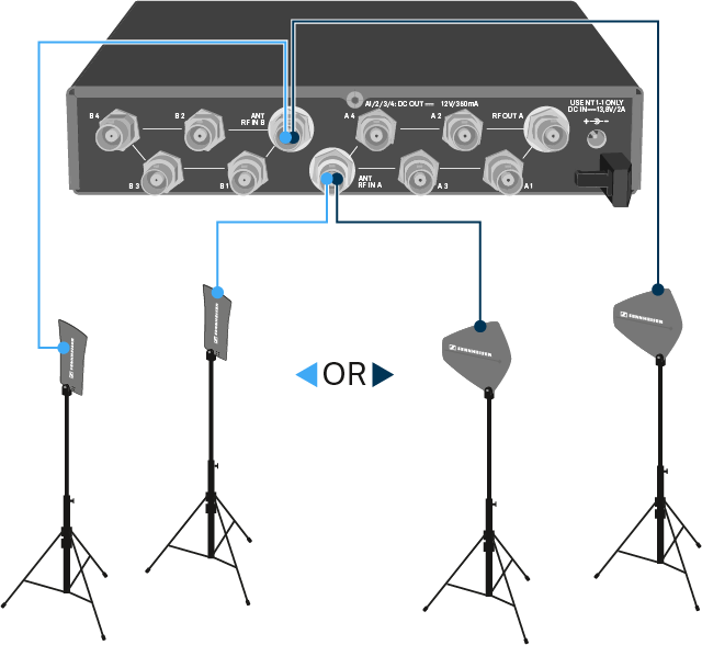 Montez deux antennes, ou bien une antenne et un amplificateur d’antenne combinés, sur les connecteurs BNC