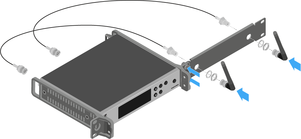 Si vous montez 2 récepteurs côte à côte, le montage frontal d’antenne est seulement possible si vous utilisez le splitter d'antenne ASA 214 en combinaison avec le kit de montage frontal AM 2 et un kit de montage en rack GA 3 supplémentaire.