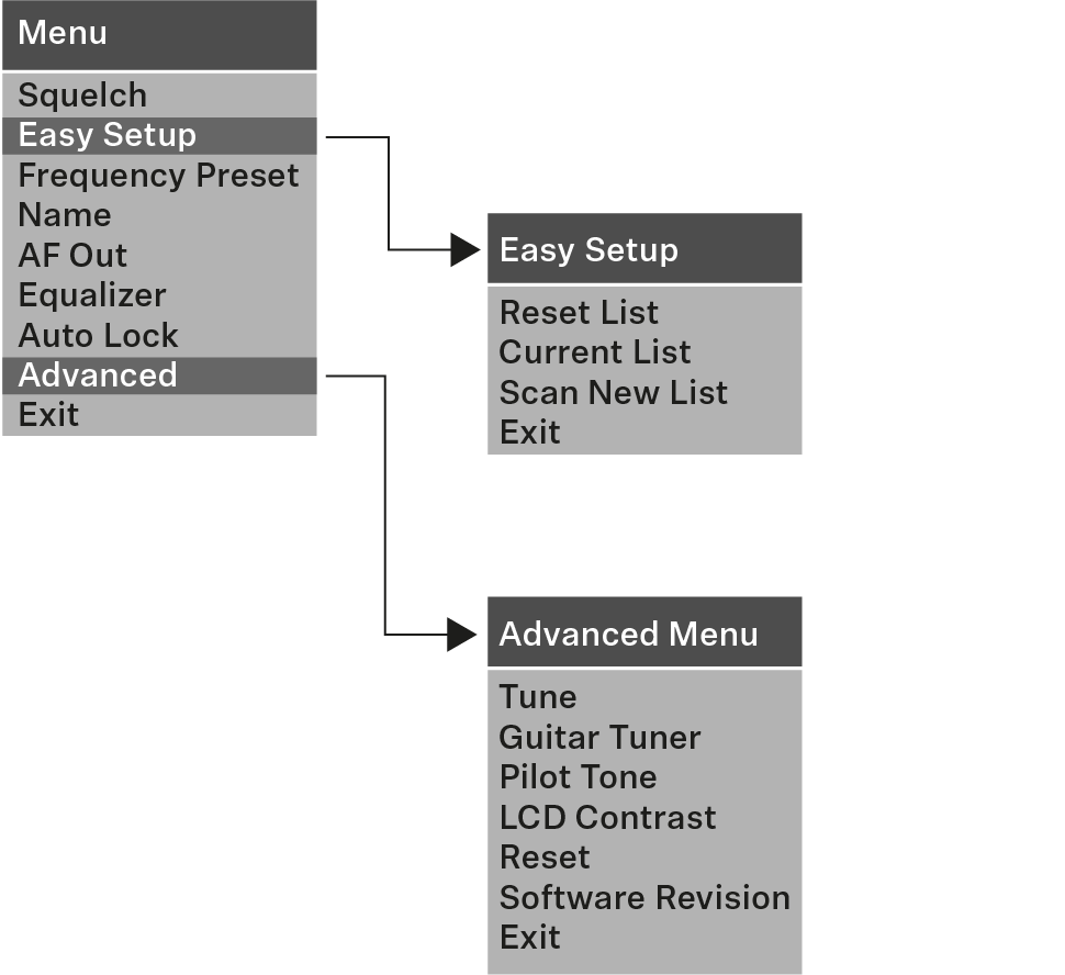 L'illustration donne une vue d'ensemble de la structure du menu de commande de l'EM 100 G4.