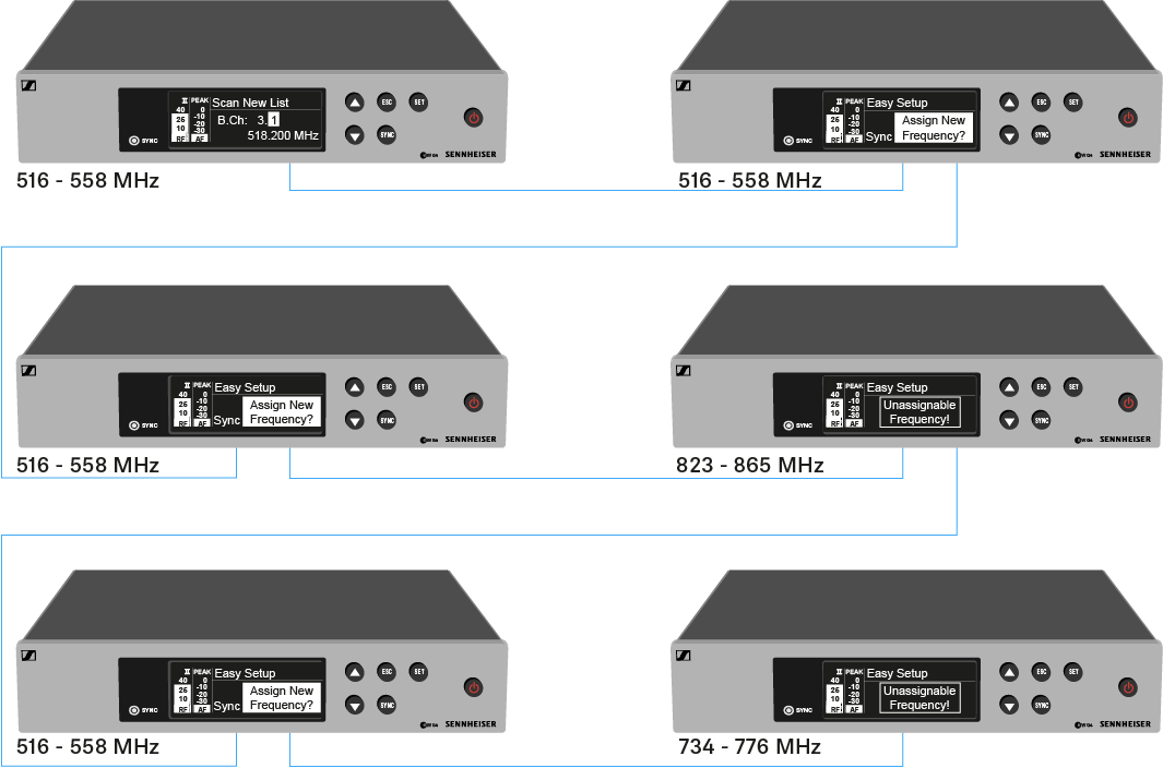 Sur les récepteurs dont les plages de fréquences ne sont pas compatibles, le message Unassignable Frequency! s’affiche.