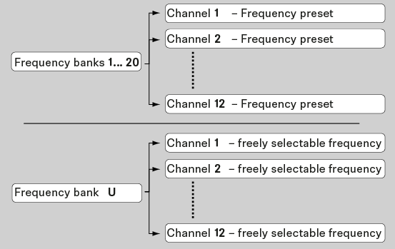 Chaque plage de fréquences dispose de 21 banques de canaux ayant jusqu’à 12 canaux :