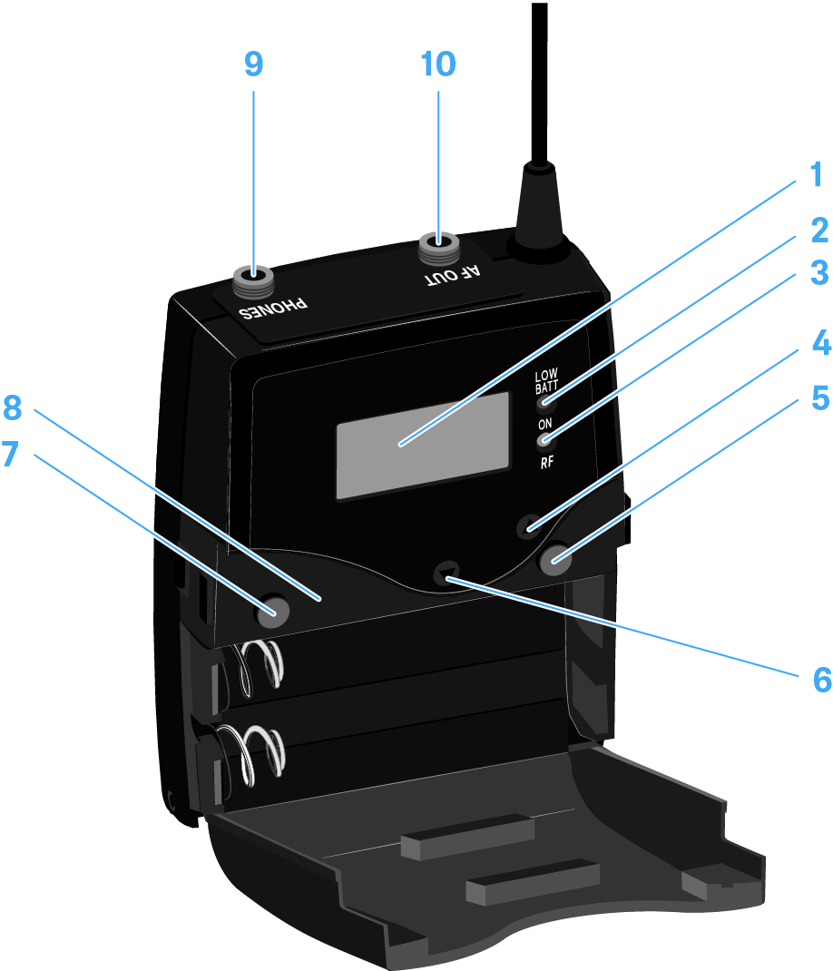 2 Témoin de fonctionnement et d'état des piles, LED rouge