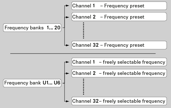 Chaque plage de fréquences dispose de 26 banques de canaux ayant jusqu’à 32 canaux :