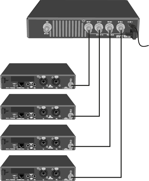 Les émetteurs SR IEM G4 et SR 300 IEM G3 sont alimentés par les connecteurs d’entrée RF IN de l’AC 41.