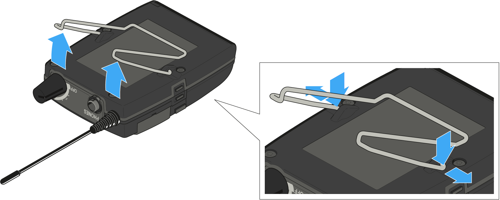 Le clip est détachable afin que vous puissiez fixer le récepteur Diversity avec l’antenne pointant vers le bas. Pour ce faire, retirez le clip ceinture de ses points de fixation, et remettez-le en place après l’avoir pivoté de 180°.