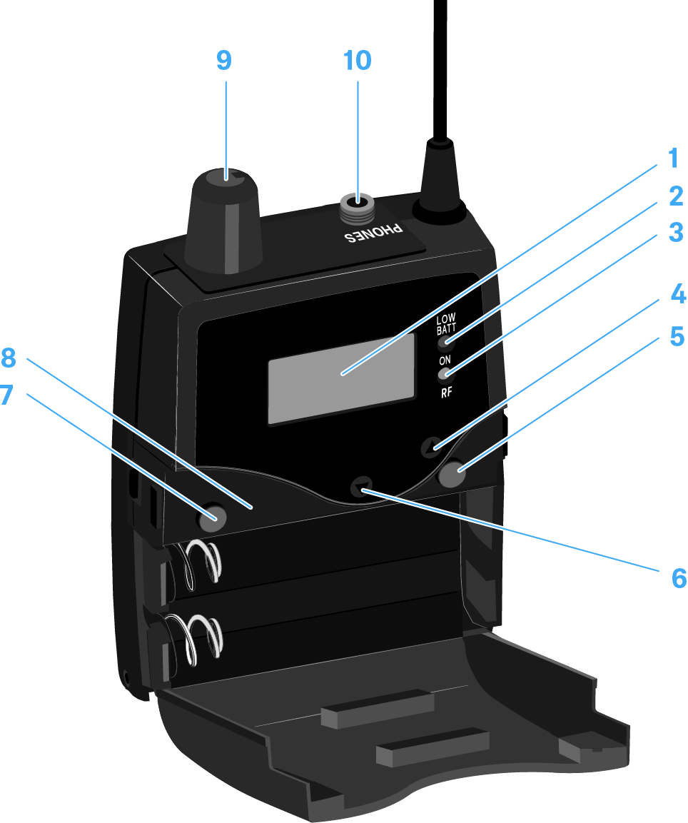 2 Témoin de fonctionnement et d'état des piles, LED rouge
