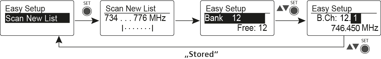 SET) pour sauvegarder la fréquence sélectionnée et pour effectuer ultérieurement une synchronisation du récepteur correspondant (voir