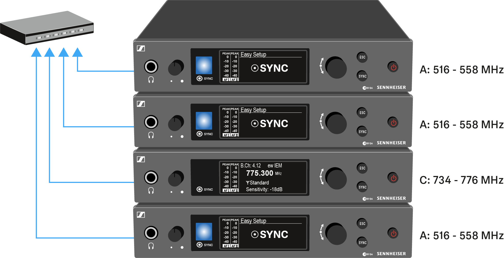 Tous les émetteurs reliés dans la même plage de fréquences activent le mode Easy Setup Sync.