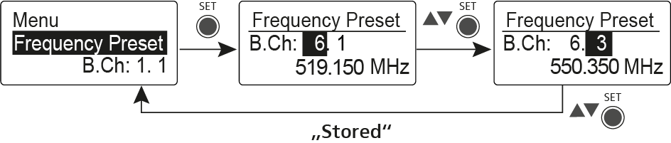Dans l’option Frequency Preset, vous pouvez régler la fréquence de réception du récepteur en paramétrant la banque de canaux et le canal.