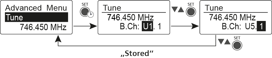 Dans l’option Tune du sous-menu Advanced, vous pouvez régler les fréquences de réception pour les banques de canaux U1 à U6.