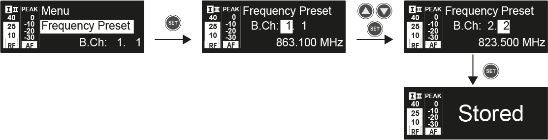 No item de menu Frequency Preset, pode configurar a frequência de receção do recetor, nomeadamente o banco de canais e o canal.
