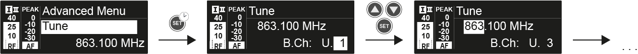 No item de menu Tune do submenu Advanced, pode definir as frequências de receção para o banco de canais U.