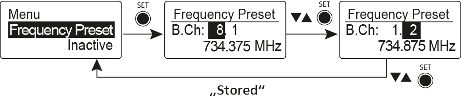 No item de menu Frequency Preset, pode configurar a frequência de receção do recetor, nomeadamente o banco de canais e o canal.