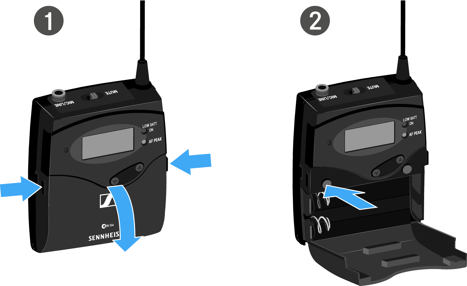 Prima os dois botões de abertura e abra a tampa do compartimento para pilhas.