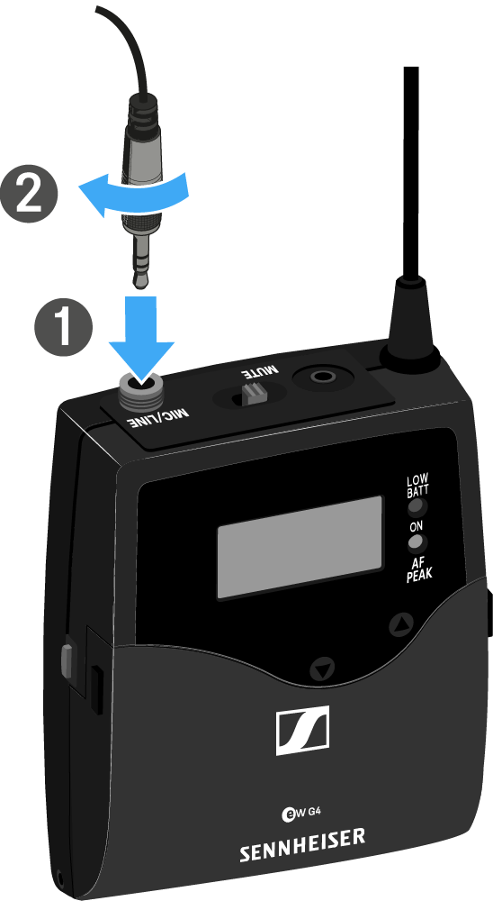 Para tal, precisará do cabo Ci 1-N (conector jack macho de 6,3 mm para conector jack macho roscado de 3,5 mm) ou CL 2 (conector XLR-3F para conector jack macho roscado de 3,5 mm) da Sennheiser.