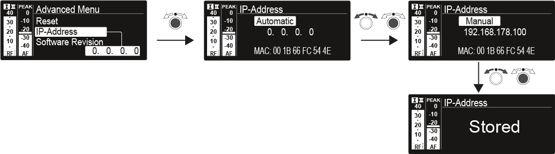 O endereço IP pode ser obtido automaticamente (Automatic) ou inserido manualmente (Manual).