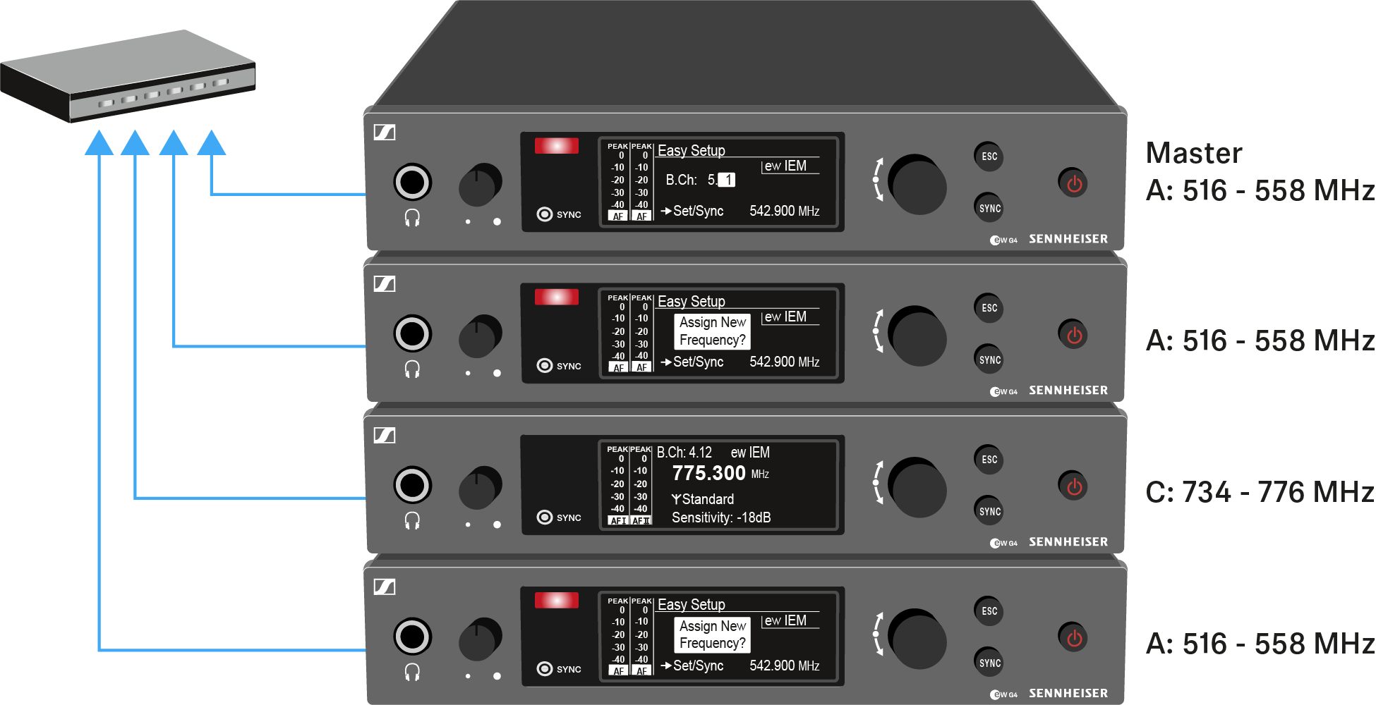Todos os emissores ligados na mesma gama de frequências ativam o modo Easy Setup Sync.