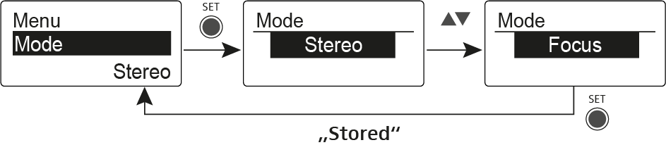 No item de menu Mode, pode alternar entre Stereo e Focus.