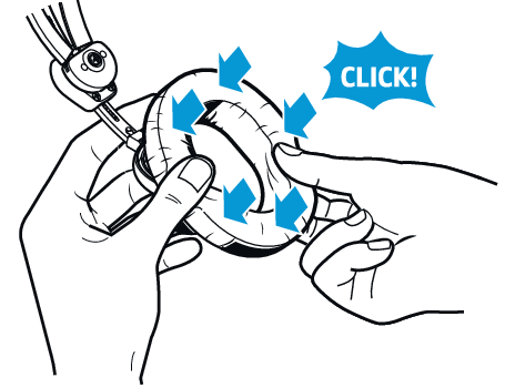 将新耳垫固定在耳套上,具体方法是在整个圆周上用力按压耳垫,直至听到六个卡扣已全部卡入。